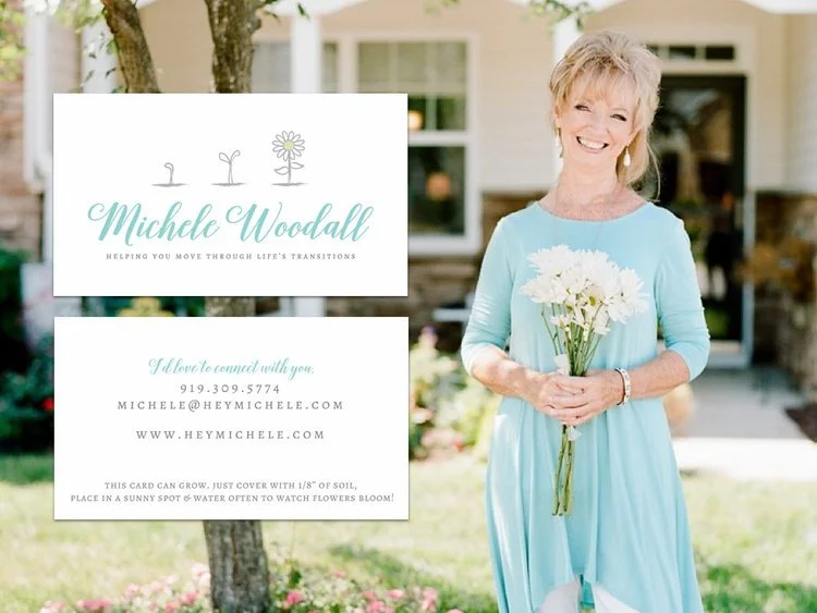 One of my favorite parts of this project was creating business cards that went outside the box and told Michele's story in a way that would be memorable and inviting to her ideal clients. I created what appears to be a deceptively simple / basic design as you see in the below image. They are standard sized business cards, but what you may not realize by looking at them here - they are printed on SEED PAPER!